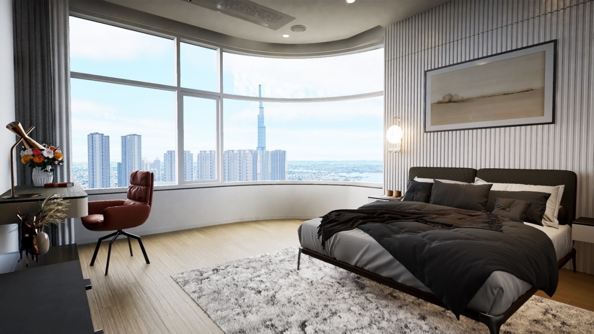 Các căn hộ được chủ đầu tư sắp đặt có chủ đích từ tầng 20 trở lên, đem đến tầm nhìn thoáng rộng ra sông Sài Gòn và công viên trung tâm. Không những thế, thiết kế ban công rộng cùng với việc lắp đặt khung cửa kính lớn ở cả phòng khách và phòng ngủ giúp tối ưu ánh sáng, tầm nhìn panorama, chủ nhân tương lai dễ dàng hoà cùng thiên nhiên.