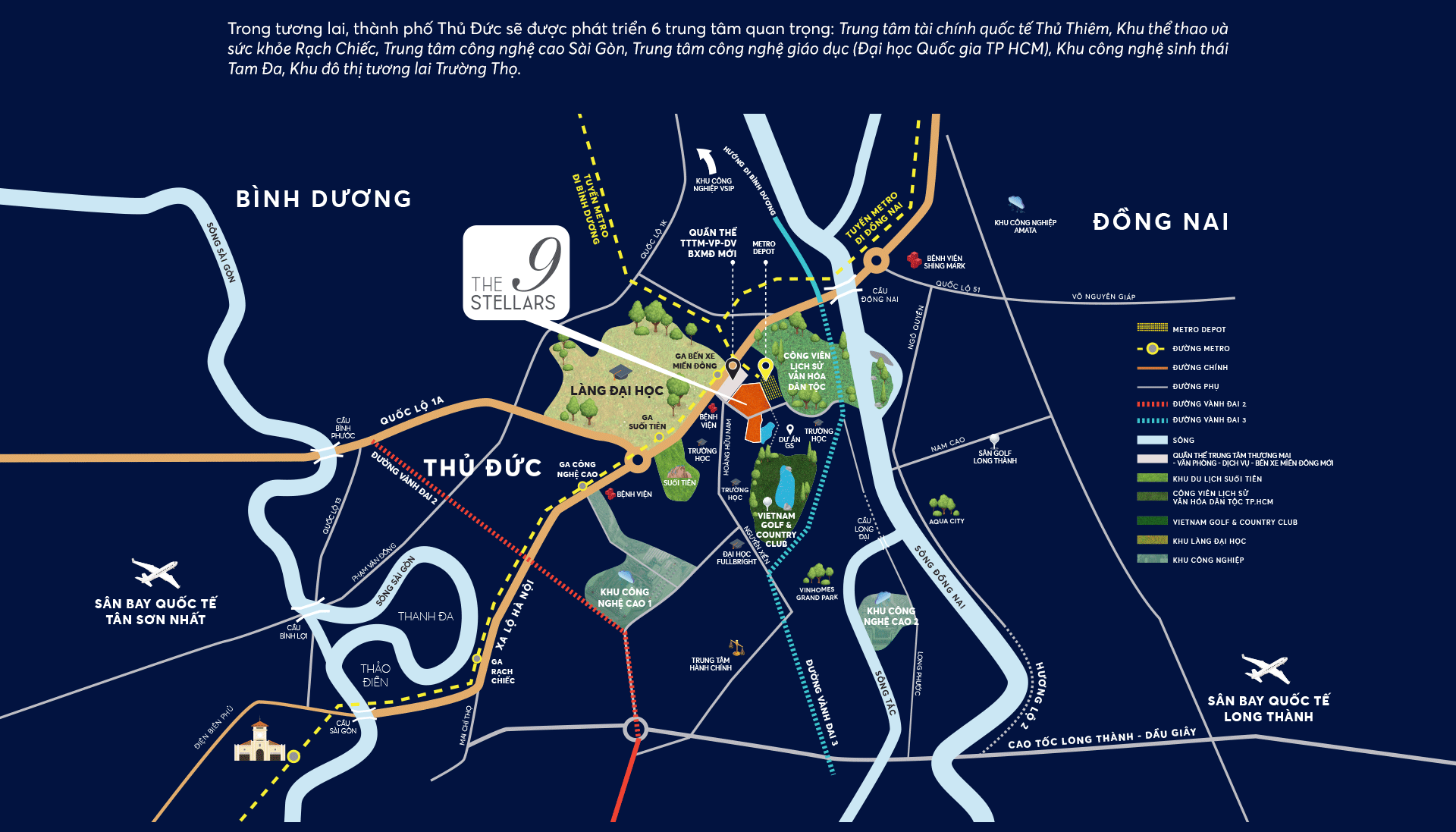 Dự án The 9 Stellars cách ngã ba đường Hoàng Hữu Nam – Quốc lộ 1A khoảng 500m. Vị trí nằm ngay trung tâm của Thành phố Thủ Đức, liền kề Bến xe Miền Đông và nhà ga của tuyến Metro số 1. Tọa lạc ngay vị trí chiến lược của Thành phố Thủ Đức, từ dự án The 9 Stellars cư dân có thể kết nối nhanh chóng đến Khu Công nghệ cao TP.HCM và Đại học Quốc gia TP.HCM – điểm cộng lớn hứa hẹn tạo nên một cộng đồng dân cư cao cấp, các chuyên gia trong và ngoài nước ngay tại dự án.